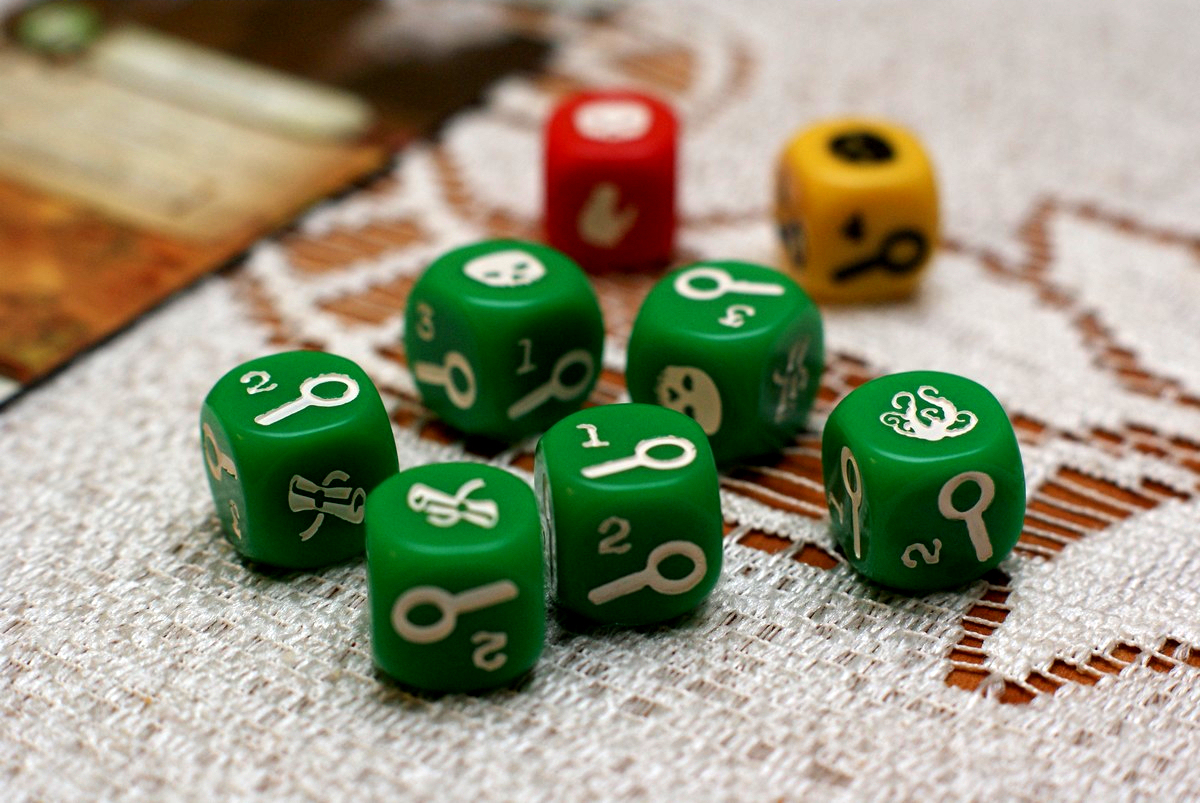 Wykonywanie zadań polega z grubsza na rzucaniu zestawem kości ze specjalnymi znakami, odpowiadającymi symbolom na karcie zadania. Jeśli symbole zgadzają się z wynikiem rzutu kośćmi, zadanie zostało wykonane. Jest to oczywiście nieco bardziej złożone, niż wynika z mojego lakonicznego opisu, niemniej jednak są to bardzo proste zasady, które łapie się w mig. Do dyspozycji mamy sześć podstawowych zielonych kości, oraz dwie dodatkowe – czerwoną i żółtą, które można dołączyć do puli, po zużyciu odpowiedniej karty przedmiotu.